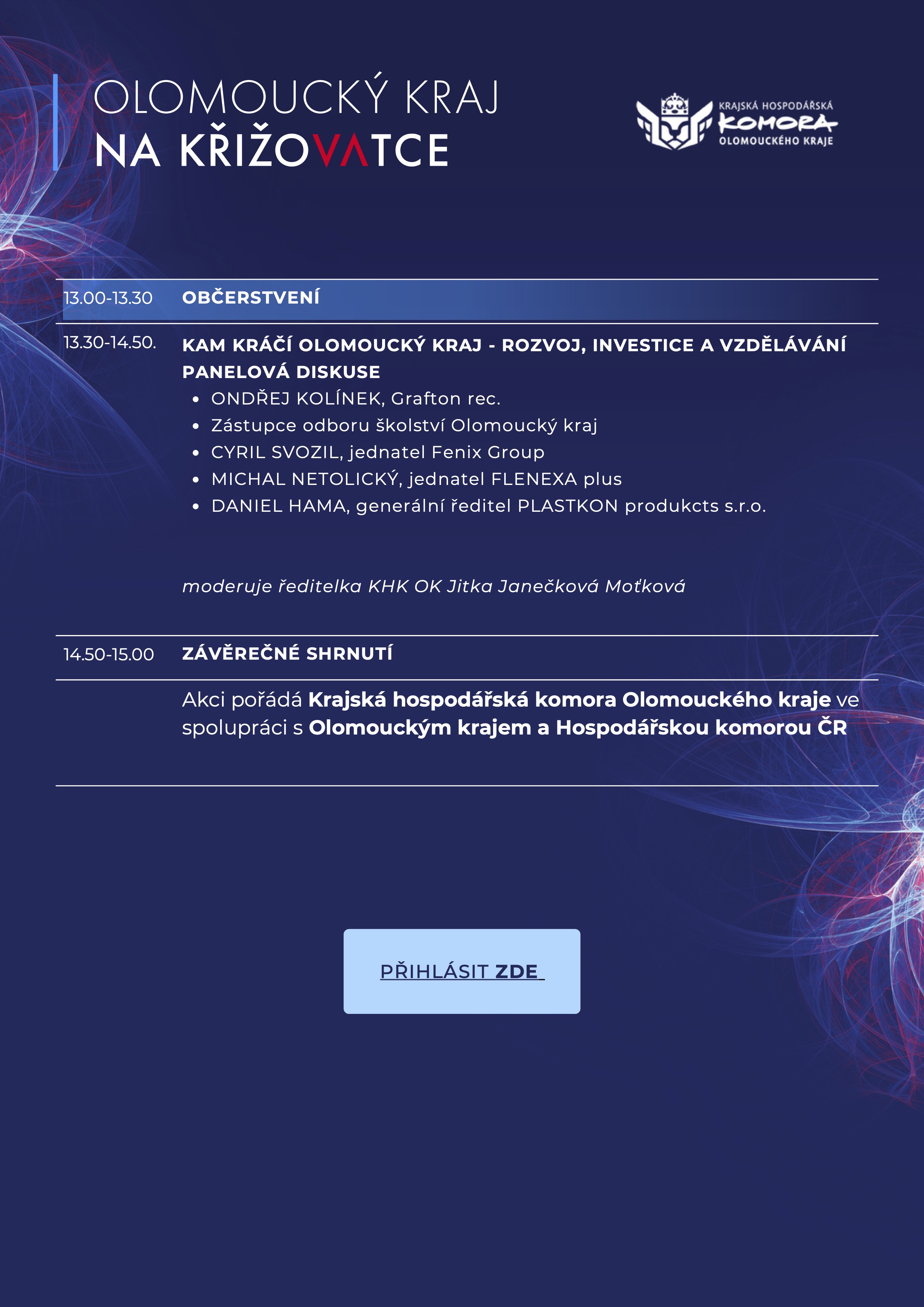 Konferenci připravuje Krajská hospodářská komora Olomouckého kraje ve spolupráci s Olomouckým krajem a Hospodářskou komorou ČR. Akce navazuje na celostátní koncept "Česko na křižovatce" - více informací naleznete nawww.ceskonakrizovatce.cz a v přiloženém programu.